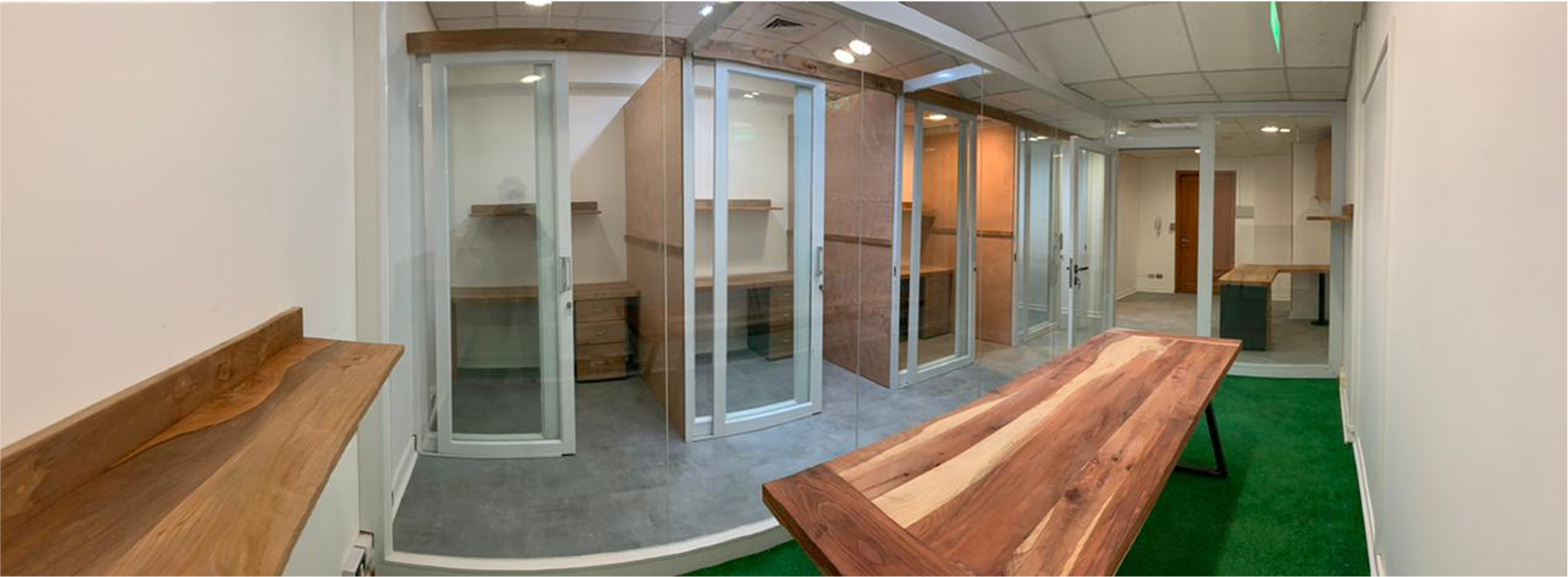 Cuatro módulos de oficina, sala de reuniones, baño y cocina. Completamente amoblados estilo co-work. u oficina compartida.